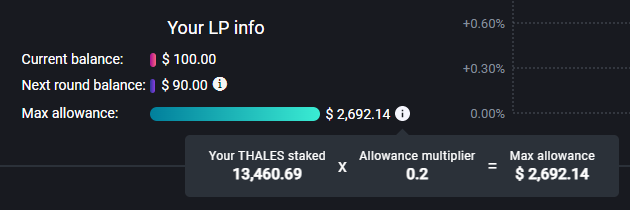 Every THALES token staker will have a capped allowance on how much they can LP based on the amount of THALES token they are staking. The ratio between this allowance and amount of THALES staked will be controlled by a variable called: